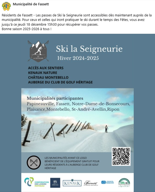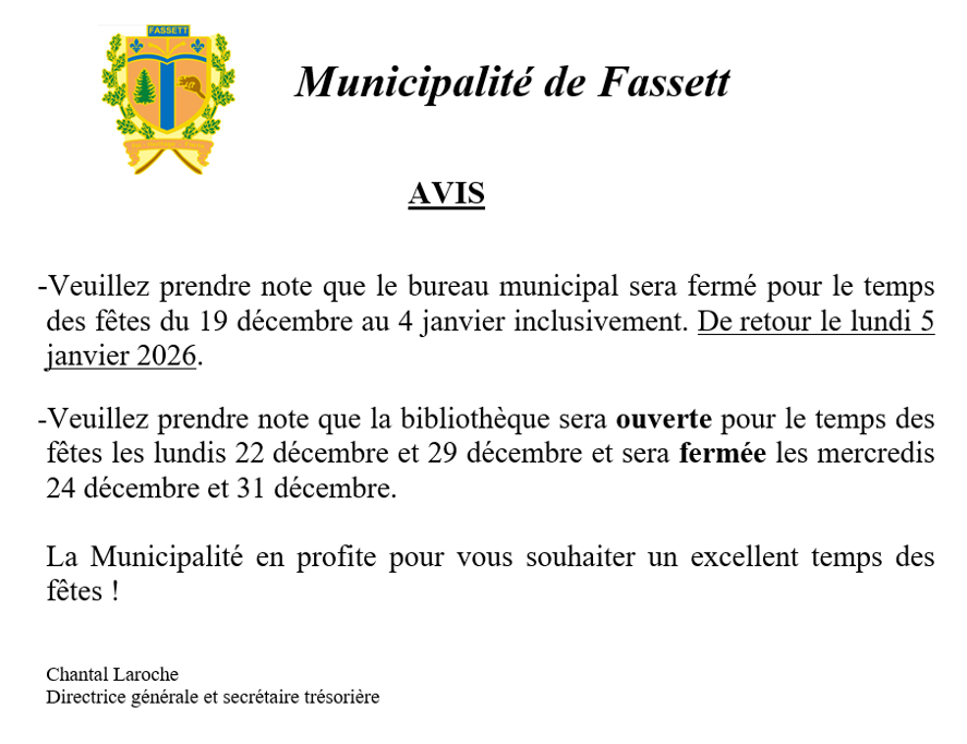 Bienvenue sur le site internet de Fassett qui se veut une source d’information importante pour tous ceux qui désirent s’informer, découvrir et se renseigner. Il sera mis à jour régulièrement afin que l’information en provenance des divers services municipaux et communautaires soit toujours à jour. Être en ligne avec sa municipalité, c’est avoir la possibilité de savoir tout ce qui se passe ou simplement de se renseigner afin d’en connaître davantage sur sa région. C’est un contact au bout des doigts.