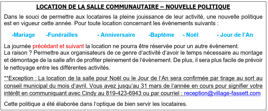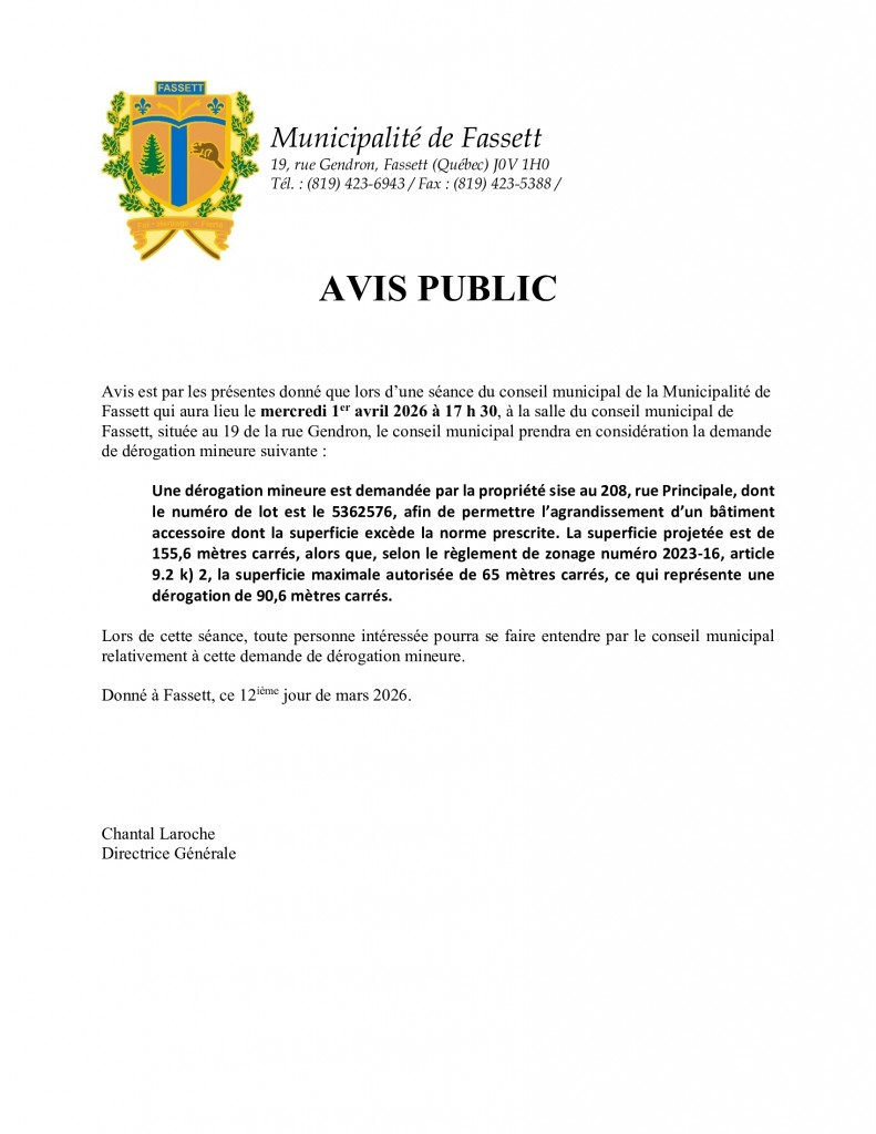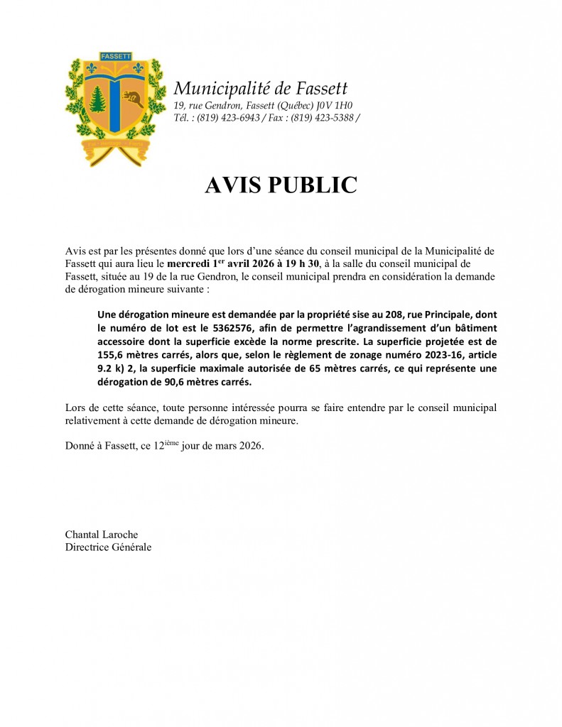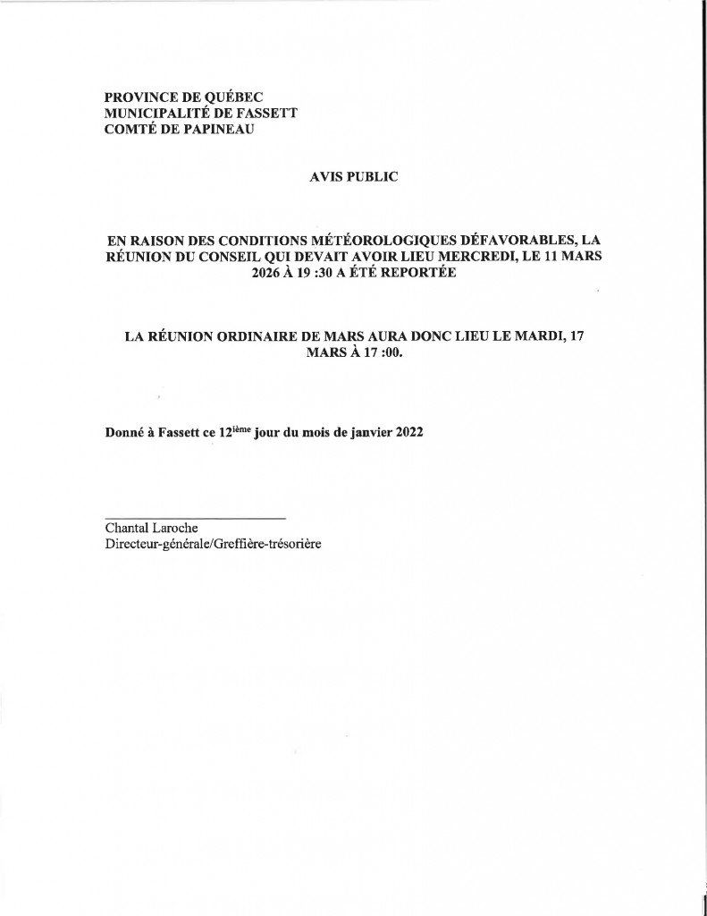 Bienvenue sur le site internet de Fassett qui se veut une source d’information importante pour tous ceux qui désirent s’informer, découvrir et se renseigner. Il sera mis à jour régulièrement afin que l’information en provenance des divers services municipaux et communautaires soit toujours à jour. Être en ligne avec sa municipalité, c’est avoir la possibilité de savoir tout ce qui se passe ou simplement de se renseigner afin d’en connaître davantage sur sa région. C’est un contact au bout des doigts.